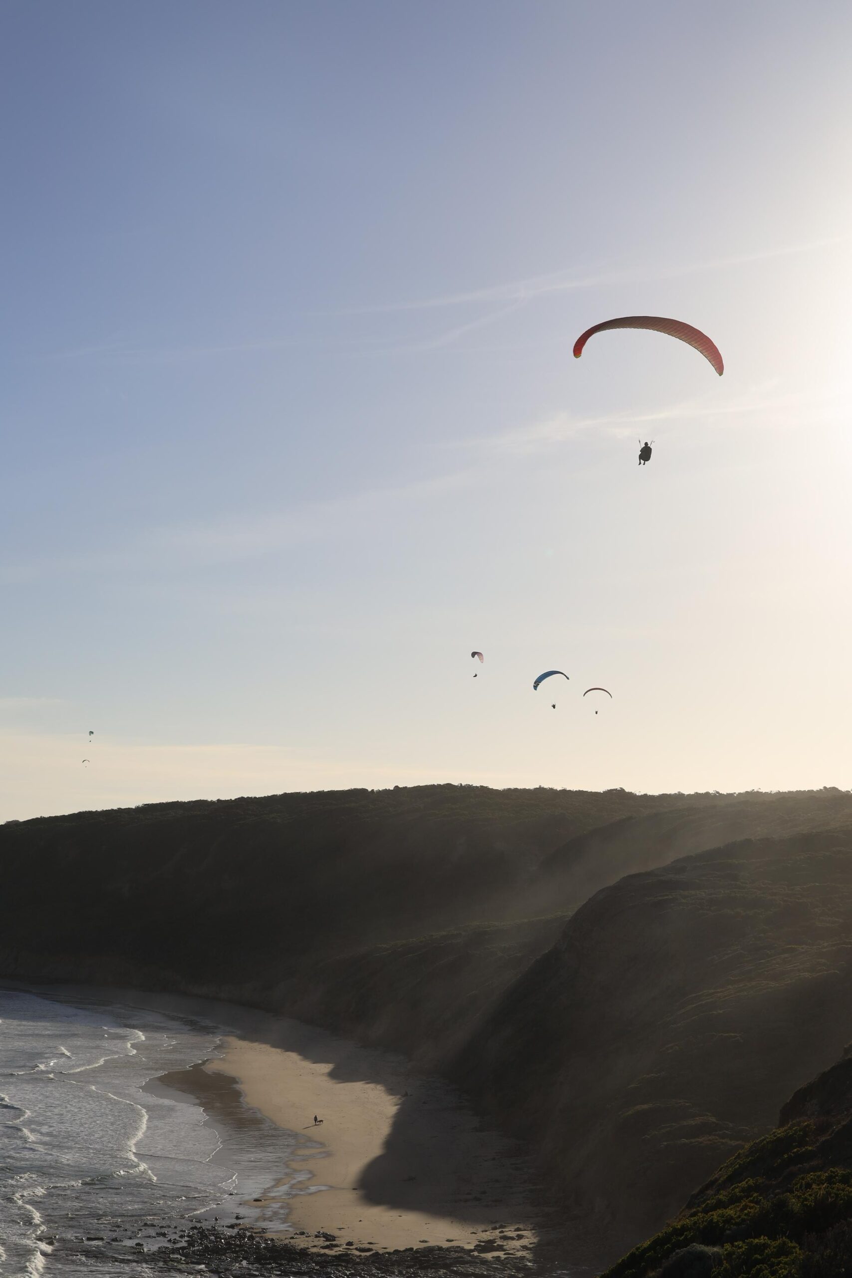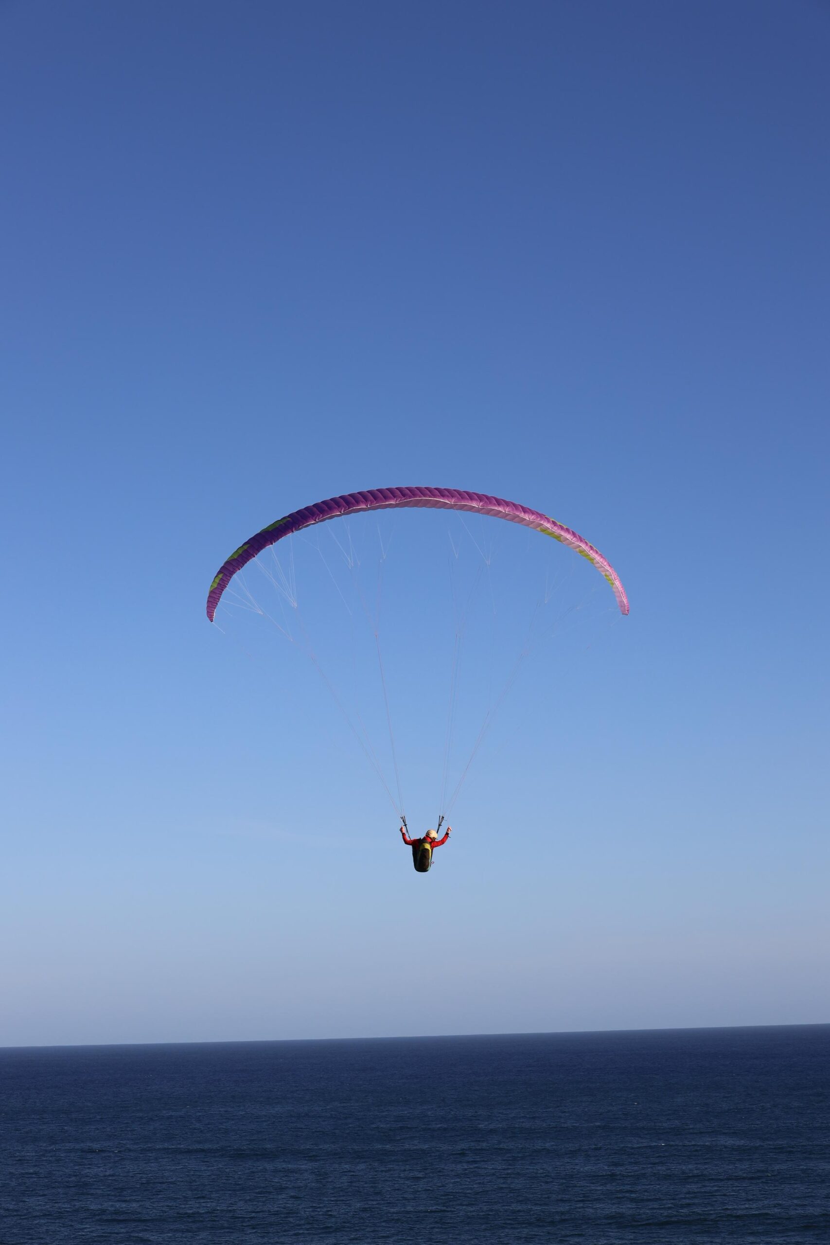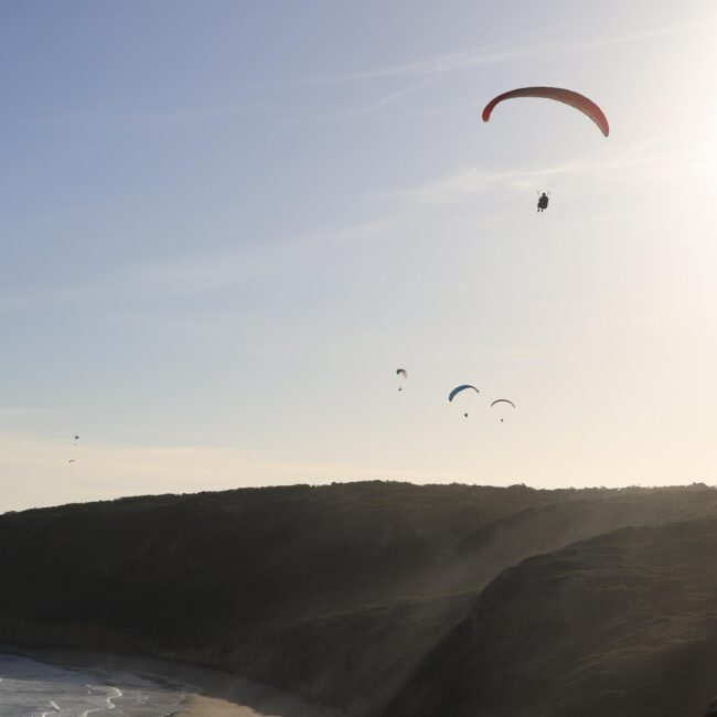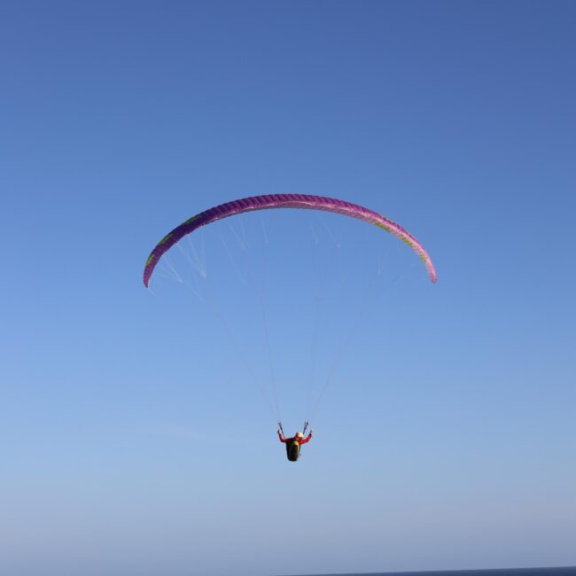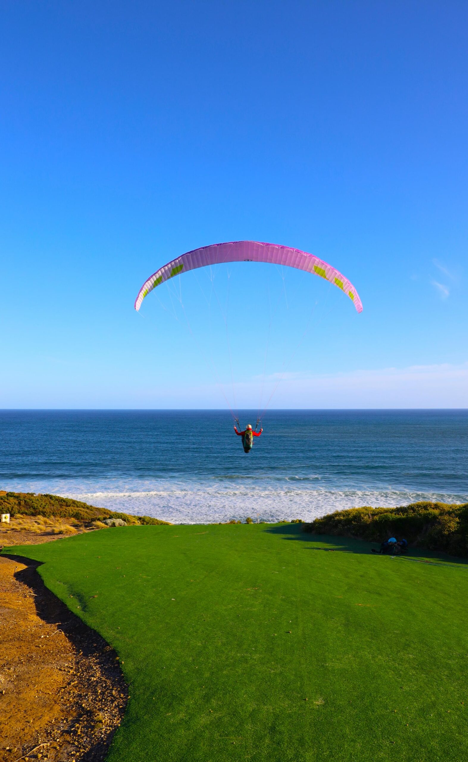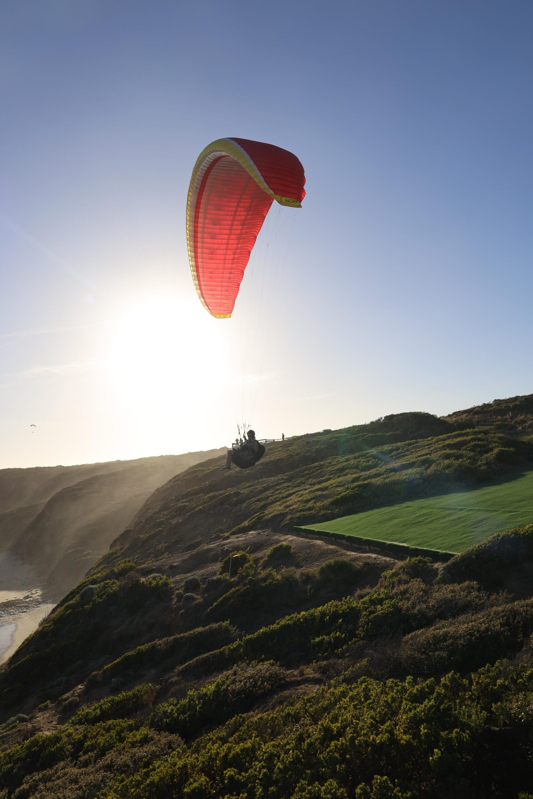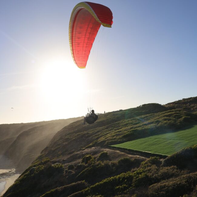 Embark on an exhilarating paragliding adventure over a grassy cliff by the ocean. Feel the freedom of flight and the thrill of the open sky.
